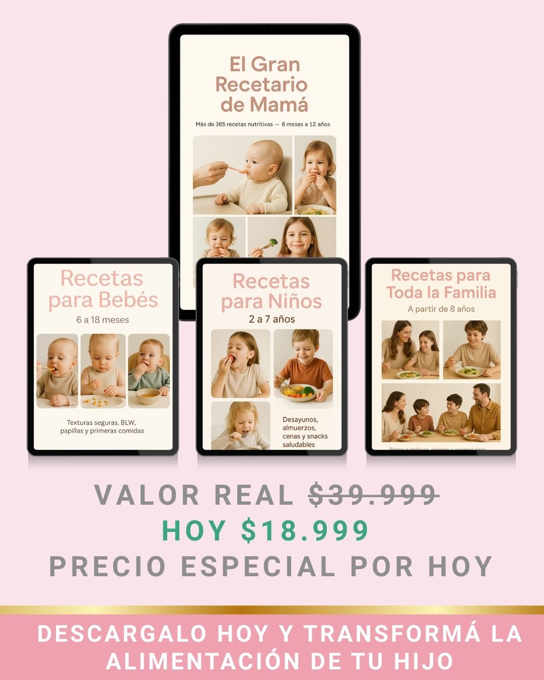 Es un pack completo con más de 200 recetas para bebés, niños y toda la familia, organizado por momentos del día y edades, para que sepas qué cocinar en cada etapa.