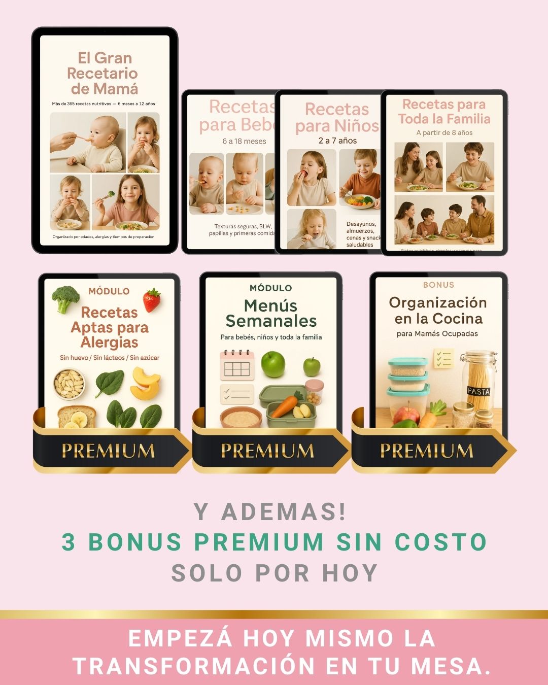 +200 recetas para bebés, niños y toda la familia, más 3 bonus adicionales para organizar tus comidas y hacerlas aún más simples y ricas.